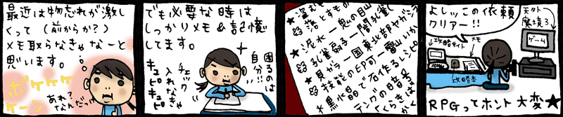 「どうせDailyしか更新してないんでしょ★」という声が聞こえたような気がしたので、 FlashMXをおべんきょうしていて、試しに作ってみたってのもあります。 秋に、Flashアニメーションのイベントがあって、そこに作品を出させていただくことになってます。 あとは、携帯をFOMAにしようと思っています。で、今月中に、携帯サイトの方をFOMA対応にしたいなあとか思っています。 梅四ランドの方もいろいろいじりたいのです。本部のキャラのページも、構想がでかくなりすぎてどうしようとかいう感じです。 で、どれもこれもうきゃーっとなって、逃避するという、この癖をまず、なんとかしなくてはいけませんのう。 |
